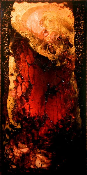 Eagles has been using preserved animal blood in his multidimensional works for over a decade. He applies blood to layers of clear Plexiglas and then permanently preserves the organic material with layers of resin, allowing the high-gloss surfaces to suspend the fluid, organic forms. In the presence of light, the blood's translucency is revealed under and between the multiple layers of clear resin, retaining and vibrating the light and illuminating pools of reds/blacks and proteins with sealed-in air bubbles; the results are remarkably luminous and always breathtaking, as the blood permanently maintains its rich color and natural texture.
