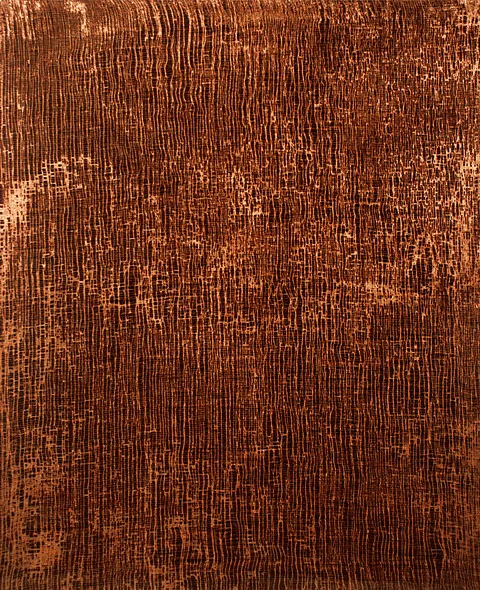 Describing his new work, Eagles says: "I use various mark-making methods, including layering the blood at different densities as well as heating, burning, and aging the material. Copper, a conductor of electricity, is sometimes mixed with the blood, imparting a unique, fiery energy. Blood-soaked gauze, stretched over the surface, creates another textural layer that serves as a map of memory and homage to ancient wrapping rituals. In some instances, blood that has decomposed for years forms dense masses that are ground into dust and tossed into the works, as a sign of passing and change."